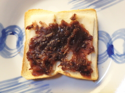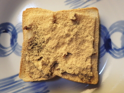 焼きあがったトーストの上からあんこを塗ったら、茶こしできなこをふってください。