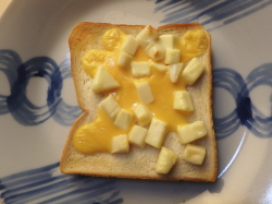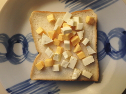 食パンに3種のチーズをトッピングしたら、5分程トーストしてください。