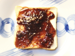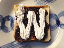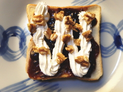 トーストした食パンに2を塗り付けたら、上からホイップクリームをしぼって、くるみを飾って出来上がり。