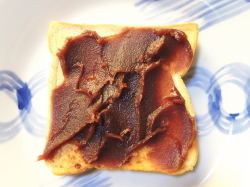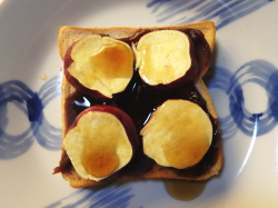 トーストした食パンに、あんこを塗り、その上にサツマイモをトッピングしたら、メープルシロップをかけて出来上がり。