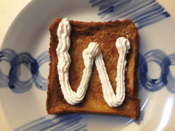 - 焼きあがったフレンチトーストをお皿に盛り付けたら、ホイップクリームを絞って出来上がり。