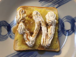 焼きあがったトーストのうえから、ホイップクリームを絞ります。