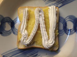 焼きあがったトーストのうえから、ホイップクリームを絞ります。