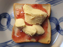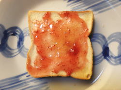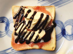 その上から、イチゴジャムを塗ったら、アイスをトッピングしてください。