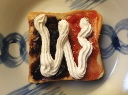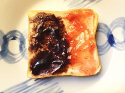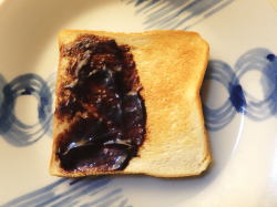 トーストした食パンに、イチゴジャムとチョコレートジャムを半々で塗ります。