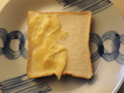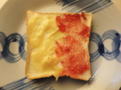 食パンにカスタードジャムといちごジャムを半々で塗ります。