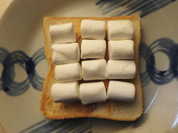 食パンに、ピーナッツバターを塗ったら、その上にマシュマロを並べて、5分トーストしてください。