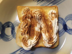 その上にホイップを絞ったら、シナモンシュガーをふりかけてください。