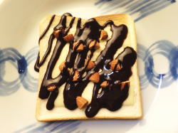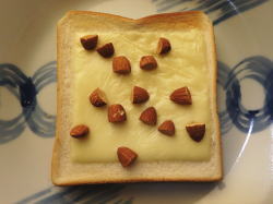 焼きあがったトーストの上に、2等分したアーモンドをトッピングしてください。