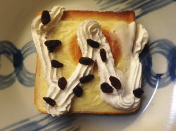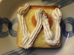 トーストの上からホイップを絞り、レーズンを散らして出来上がり。