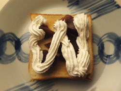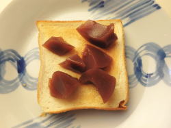 トーストした食パンに、水ようかんを盛り付け、上からホイップを絞ってください。