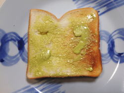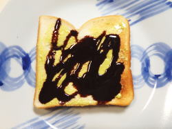トーストにピスタチオスプレッドを塗り、上からチョコレートソースをかけて出来上がり。