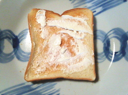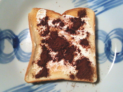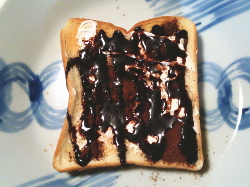 トーストの上にクリームチーズを塗ったら、ミロとチョコレートソースをかけて出来上がり。