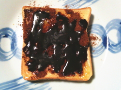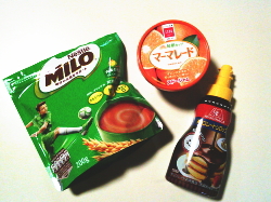 トーストの上に、マーマレードジャムを塗って、ミロとチョコレートソースをかけて出来上がり。