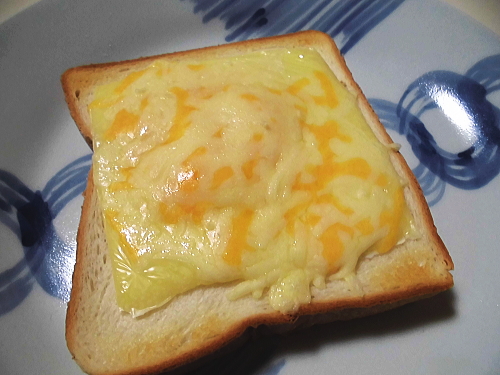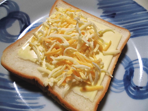 食パンにスライスチーズをのせ、その上にピザ用チーズを追加して盛り付け、トーストします。