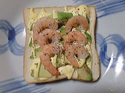 ※アボガドをしく前に、マヨネーズを塗っている写真ですが、マヨネーズが強すぎたので、一番最初のマヨはいらないかなぁ。という感じです。アボガドとエビ、黄金の組み合わせですね。