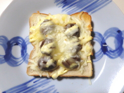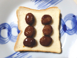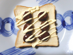 食パンに肉団子を6個並べ、マヨネーズをかけます。