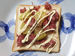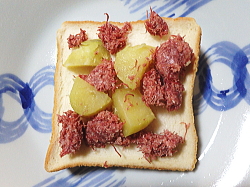 食パンに、じゃがいもをトッピングし、空いた隙間にコーンビーフをトッピングします。