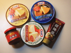 カットした3種のチーズを甜麺醤と豆板醤で和えたら、食パンに盛り付けてください。
