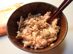焼き鮭の皮と骨と取り除いて身をほぐして、納豆に混ぜ込んでください。