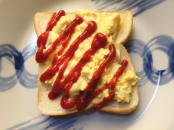 トーストした食パンに4を盛り付け、上からケチャップを絞って出来上がり。