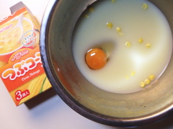 - コーンスープがとけきったら、卵を入れ、よくかき混ぜてください。