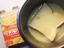 | ※コーンスープで、フレンチトーストなんて、と言うなかれ。これがなかなか美味しいんです。ぜひぜひ、やってみそ! |
