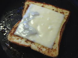 - フレンチトーストの片面が焼けたら、スライスチーズを乗せ、蓋をして焼きます。