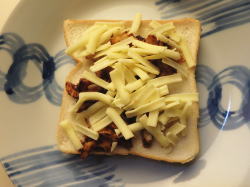 2を食パンに盛り付け、上にピザ用チーズをトッピングしてください。