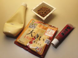 納豆のタレとからしを捨て、チューブの梅を混ぜます。