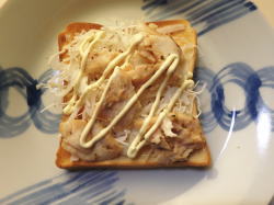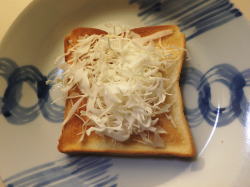 トーストした食パンにマヨネーズをしき、上に千切りキャベツを乗せてください。