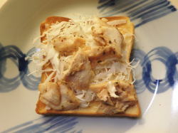 その上に、味付きのサラダチキンを盛り付けたら、上からマヨネーズをかけて出来上がり。