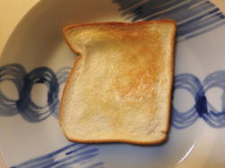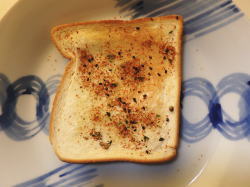 焼きあがったトーストに、オリーブオイルを塗り、七味をかけて出来上がり。