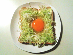 - 食パンにマヨネーズで淵を描いたら、千切りキャベツをドーナツ状に乗せてください。