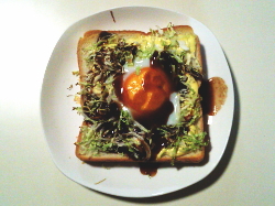 - トーストの上からマヨネーズ、ソース、かつお節、青のりをトッピングして出来上がり。