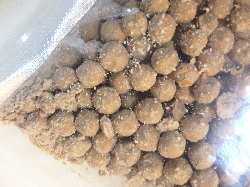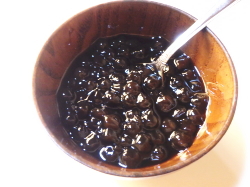 | ※なんと、タピオカを茹でるのに、30分、蒸すのに30分もかかりましたよ。ゆでたタピオカを冷蔵庫に入れておくとまずくなるので、食べる直前に熱湯でゆでなおし。面倒だけれど、タピオカの黒蜜との相性は抜群。なかなか食感の楽しいトーストができました。癖になるかどうかは知らん! |