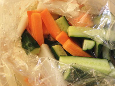 | 気軽に作れて、野菜不足を補う をもっとーにしてます。 .ピクルス常備菜 <材料> ・きゅうり 2本 ・にんじん 2/3本 ・大根 1/8本 ・簡単酢 1本弱 <作り方> 1)野菜たちをすべて拍子切りしてください。 2)ビニールに1の野菜を入れ、簡単酢に漬け込んでください。 3)1日漬け込んだら出来上がり! ![]() シンプルな味付けですし、 常備菜としても最高なので、 ぜひ作りおきしてください。 玉ねぎもおいしいです。 |