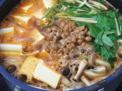 | お豆腐といえば、 ヘルシーなたんぱく源 冷ややっこもいいけれど、 冬場はやっぱり湯豆腐よねという わけで ごちそう湯豆腐(キムチの素) <材料> ・水 500ml ・水菜 1/2袋 ・豆腐 1個 150g ・しめじ 1/2袋 ・納豆 1個 ◎キムチの素 50ml ◎鶏がらスープの素 小さじ1 ◎しょうゆ 大さじ1 <作り方> 1)水菜はざく切りに。豆腐は食べやすい大きさにカット しめじは、石突を落としてほぐしてください。 2)納豆はたれを混ぜ込んでスタンバイ。 3)鍋に水をはり、◎の調味料で味付けしたら、 1を投入して、中央に2を盛り付けます。 4)しばし煮込んで、豆腐があつあつに成ったら 出来上がり。 ![]() 冬といえば、 鍋、え?鍋? え?ごちそう湯豆腐だよねー まーどっちでもいいけど、 オツですよ。 |