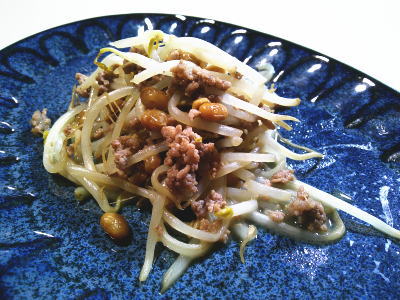 | 今回は 栄養をヘルシーに 摂るのを目標に しました。 <材料> ・もやし 1袋 ・納豆 1パック ・ひき肉 100g ・水 大さじ4 ◎みりん 大さじ1 ◎しょうゆ 大さじ1 ◎酒 大さじ1 ◎塩 少々 <作り方> 1)納豆は付属のたれとからしを 入れて混ぜておいてください。 2)フライパンに水を入れ、 ひき肉をゆで炒めします。 3)1ともやしを入れ、 炒めたら、◎の調味料で 味付けします。 ![]() 油を使っていないから ヘルシーっちゅやー ヘルシーなんですが、 すっげぇ 栄養摂っているから 痩せる食事ではなさそう! めんぼくない! |