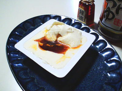 | ラー油は かなり好きな調味料で ぜひ試したい!と成りました。 <材料> ・豆腐1個 ◎麺つゆ(2倍濃縮) 小さじ1.5 ◎ラー油 少々 <作り方> 1)豆腐の蓋をはがしたら スプーンでほじくります。 2)開いた穴めがけて◎の 調味料をぶち込んで出来上がり。 ![]() ラー油は ちょっと垂らすだけで 相当辛いので お好みで 辛さを調整してね! |