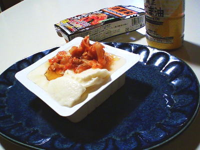 | 豆腐に キムチは 人気ですね? そこに ごま油は どうだろうか? と思い かけました。 <材料> ・豆腐1個 ◎キムチ 30g ◎ごま油 小さじ1 <作り方> 1)豆腐の蓋をはがしたら スプーンでほじくります。 2)開いた穴めがけて◎の 調味料をぶち込んで出来上がり。 ![]() お味は 別にキムチ だけで いいかな? という感じでしたが うまい。 やー キムチは うまい! |