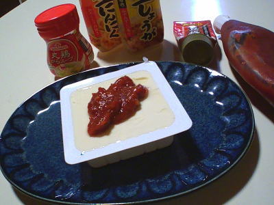 | お好み焼き風に 気をよくし 調子をこいたので 作りました。 <材料> ・豆腐 1個 ◎ケチャップ 大さじ1 ◎豆板醤 小さじ1/4 ◎鶏がらスープの素 小さじ1/4 ◎ニンニクチューブ 小さじ1/4 ◎生姜チューブ 小さじ1/4 <作り方> 1)◎の調味料を 耐熱容器に入れ 混ぜ合わせて、ラップをし レンジで1分加熱します。 2)1をお豆腐の上に 盛り付けて出来上がり。 ![]() こいつは うまい けれども エビチリみたく チリ豆腐に するのも一つの手かな? 冷たい 豆腐より 熱々の 豆腐の方が 更に美味しそう! |