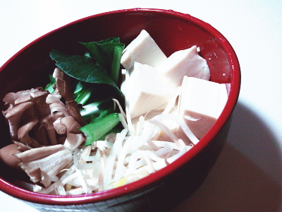 <材料> ・もやし 1/4袋 ・マイタケ 1/4袋 ・小松菜 2束 ・豆腐 1個 ◎味ポン 3回し <作り方> 1)豆腐をさいころ状にカットします。 2)小松菜をざく切りします。 3)マイタケは石突を切り落とします。 4)豆腐と小松菜、もやし、マイタケ を耐熱丼に鍋のように盛り付け、 ラップをして、レンジで4分加熱。 5)味ポンで味をつけて召し上がれ! ![]() 簡単に 豪華でヘルシーな 夕飯ができるよ! 胡麻ドレッシングでも 美味しいよ^^ |