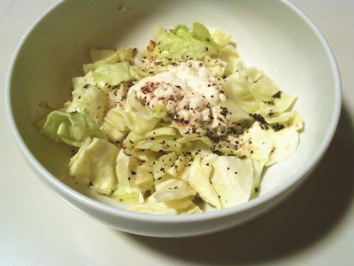 | 余りもので 一品出来ないかな? と思いました。 <材料> ・キャベツ 100g ・クリームチーズ 大さじ2 ◎バジル 少々 ◎塩こしょう 少々 ◎オリーブオイル 小さじ1/2 <作り方> 1)キャベツをざく切りに してください。 2)1を耐熱容器に入れ、 クリームチーズをトッピング。 3)◎の調味料で味付け。 4)ラップをしてレンジで 2分30秒あたためて出来上がり。 ![]() 混ぜながら あつあつを 食べてください。 何にも 食べるものが ないよー というときにどうぞ! |
