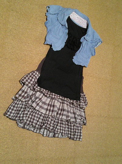 ■フリルタンク黒(¥390)/hitogonetヤフー店 ■デニムボレロ(¥100)/petitplum Yahoo!ショップ■3段フリルスカート(¥780)/Paliocollection なんか、この デニムボレロを愛しているみたい。 後、3段フリルもお気に入りです!^^ |TOP|Back|Next| 2023/08/24作成 by綾香