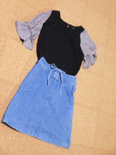 ■黒とチェックの袖リボントップス(¥499)/地元駅ナカ